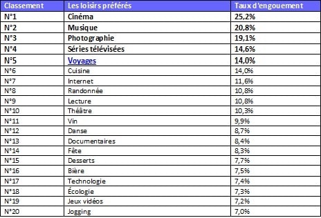 Pour se faire une idée globale, voici le panorama complet des loisirs favoris :
